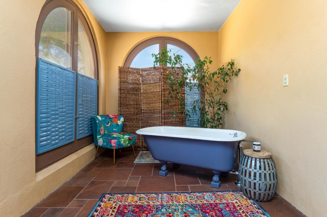 Up on the rooftop terrace, guests can enjoy panoramic views of the Verde Valley and the Sedona red rocks — one of the few places where the sunset glows in the east. The rooftop also includes a fire pit, outdoor kitchen, and bath, creating a perfect end to each day under Arizona’s star-filled sky.