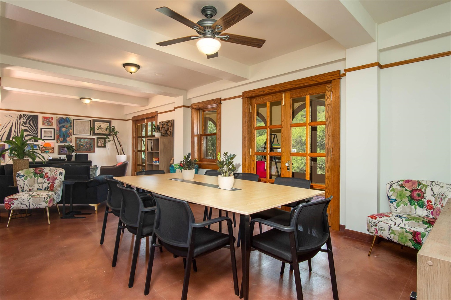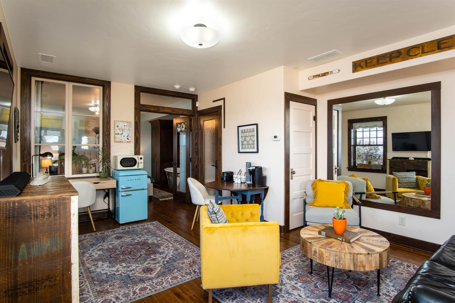 Step through The Little Daisy Jerome's grand entrance and be transported into a world of timeless beauty. The lobby’s original check-in desk and piano lounge welcome you into an open living area that flows into a dining hall seating 33, framed by sweeping arched windows and breathtaking valley views.