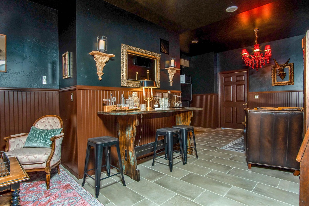 Designed by visionary craftsmen Walter and Lisa Acker, every inch of the home tells a story — from hand-built cabinetry and stone walls to the ornate ceiling of the Billiards & Theater Room, where guests unwind, play pool, or watch films on the large projection screen.